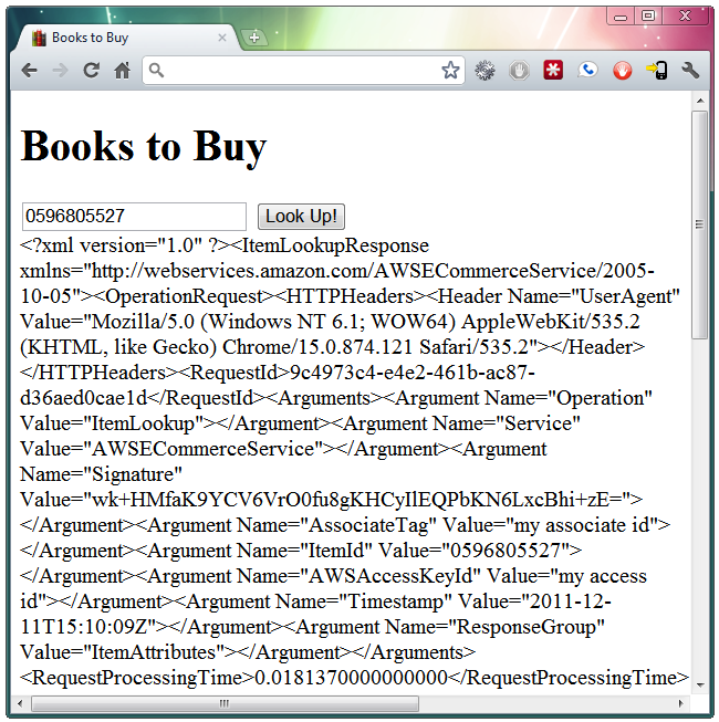 Success! Sort of. A lot of XML came back from the request, and I need to pull the necessary data out of it. I also need to explore various response groups to get the data I need. And all that will be the subject of the next post in this series.