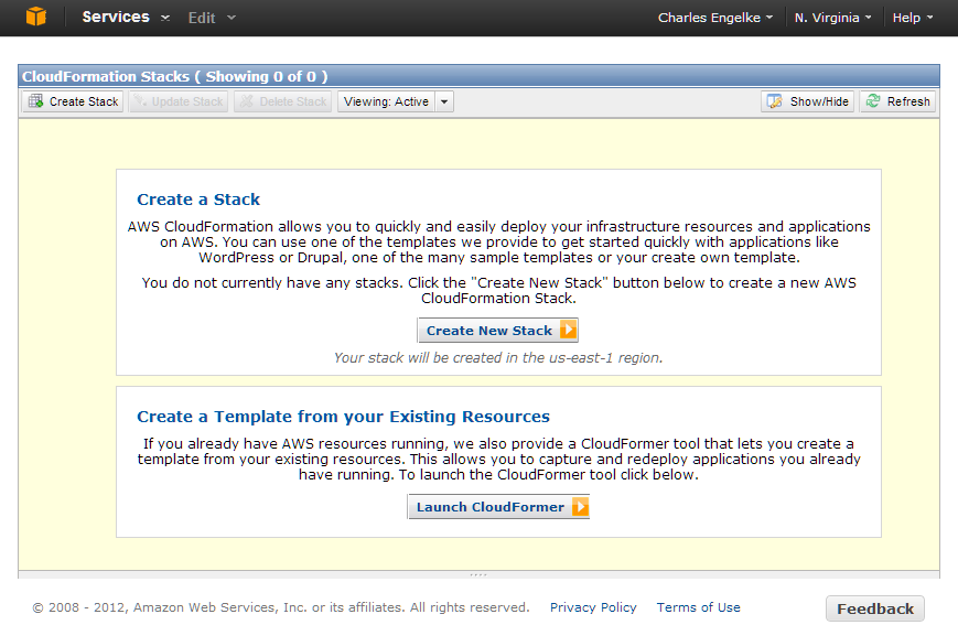 Now to create this stack. Log in to the AWS Management Console and select CloudFormation. (If you’ve never used it before, you’ll be walked through a few sign-up steps to verify your identity. A few minutes later, you’ll be able to use the console.) It currently looks like this: