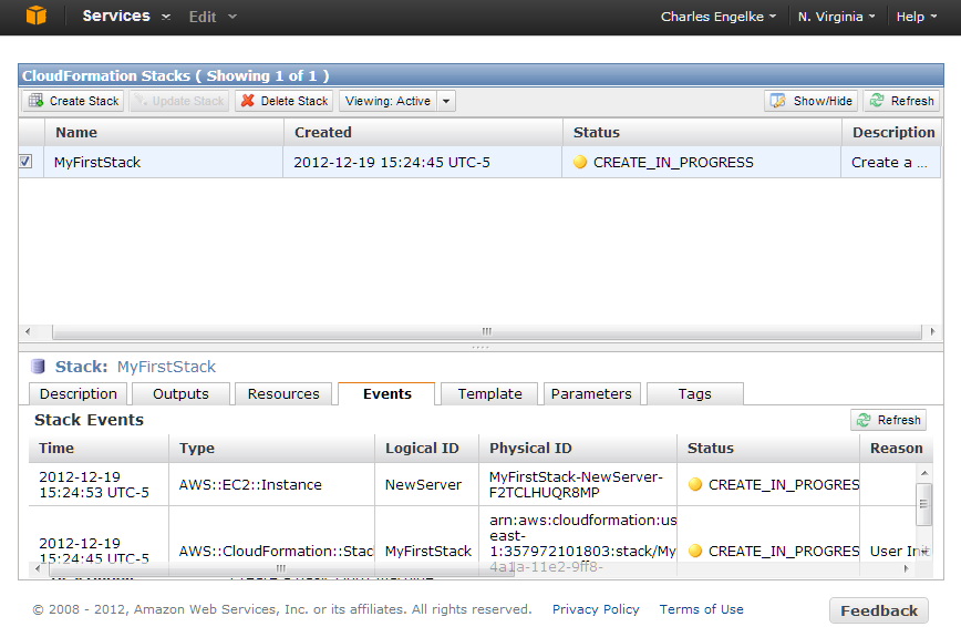 I clicked Continue, and my stack started building. I closed the acknowledgment window and looked at the console. The upper part showed all my stacks. There was only the one I just created. When a stack is selected, the bottom part shows its properties. I selected the Events tab for the screen capture below: